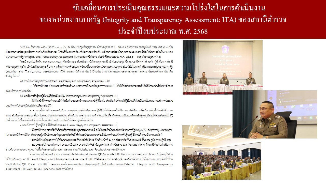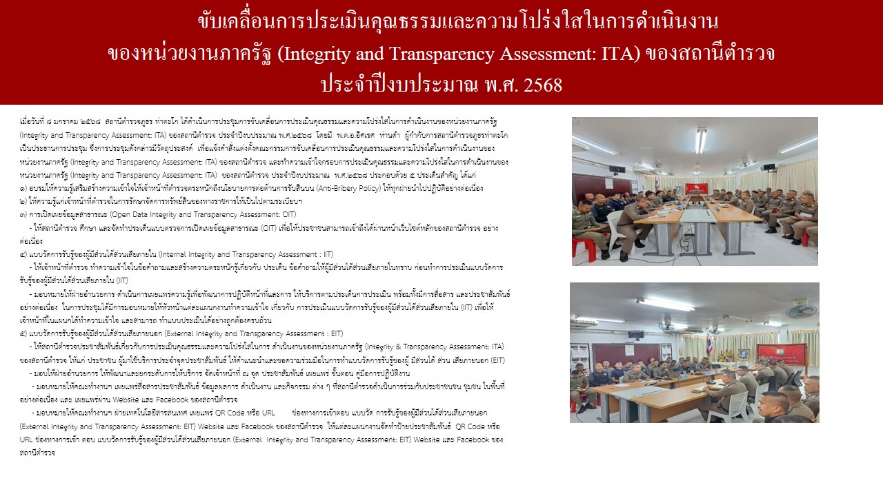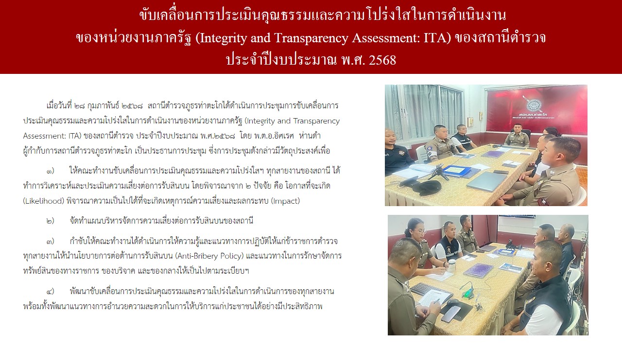 เมื่อวันที่ ๒๘ กุมภาพันธ์ ๒๕๖๘ สถานีตำรวจภูธรท่าตะโกได้ดำเนินการประชุมการขับเคลื่อนการประเมินคุณธรรม...