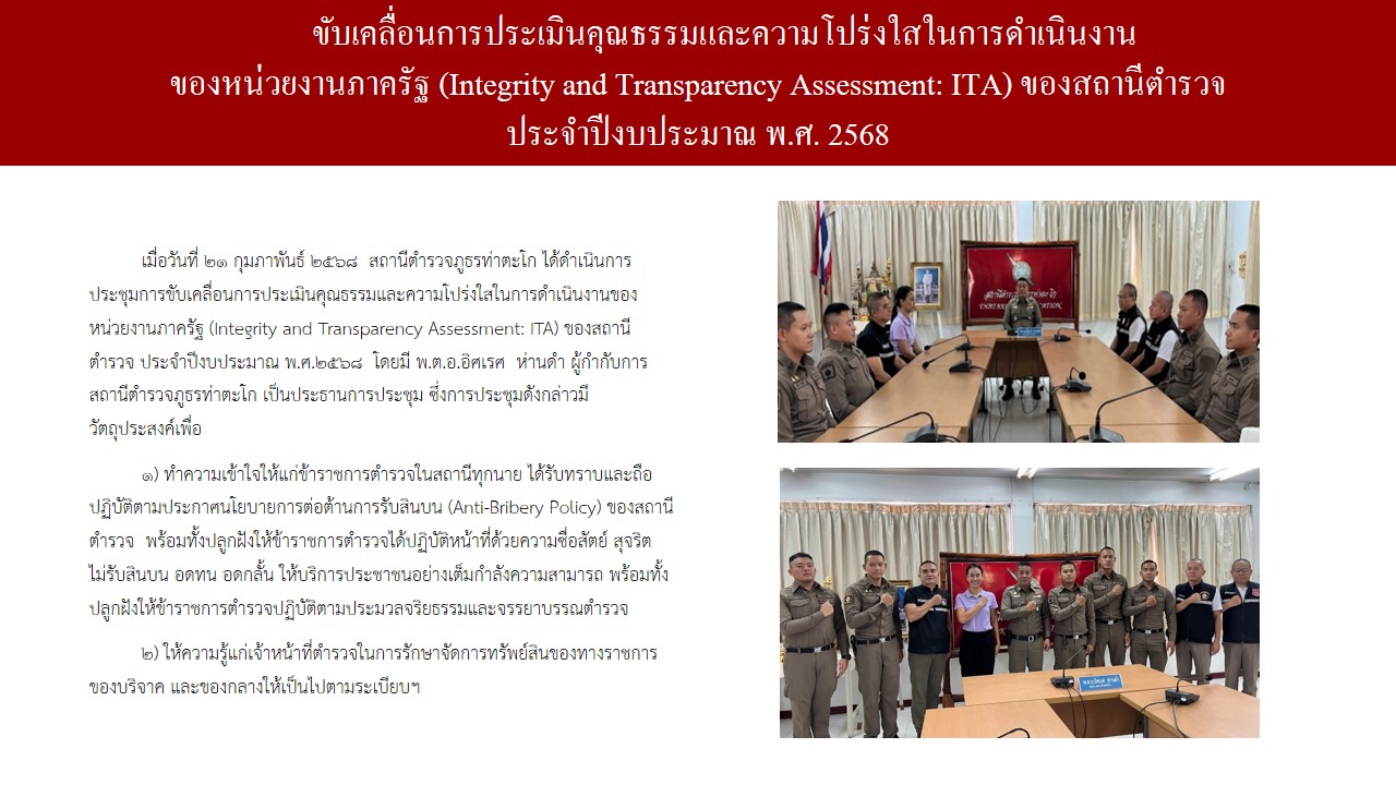 เมื่อวันที่ ๒๑ กุมภาพันธ์ ๒๕๖๘ สถานีตำรวจภูธรท่าตะโก ได้ดำเนินการประชุมการขับเคลื่อนการประเมินคุณธรร...